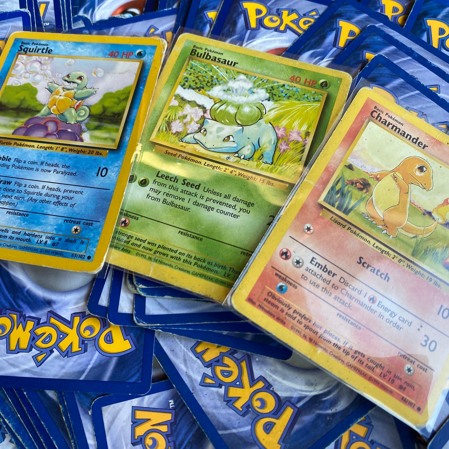 Elke set bevat Charmander, Squirtle EN Bulbasaur, de iconische 3 starters + 1 random holo uit Base Set (first 102), Jungle of Fossil.